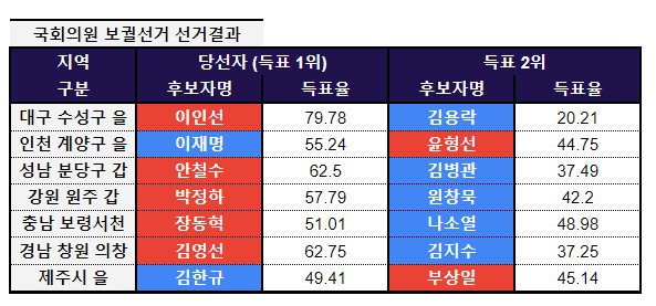 2석은 인천계양구 을, 이재명 후보와 제주시 을 김한규 후보에게 돌아갔고