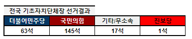 광역단체장 뿐만 아니라 전국 기초자치단체장에서도 국민의힘이 145석 vs 민주당 63석으로,